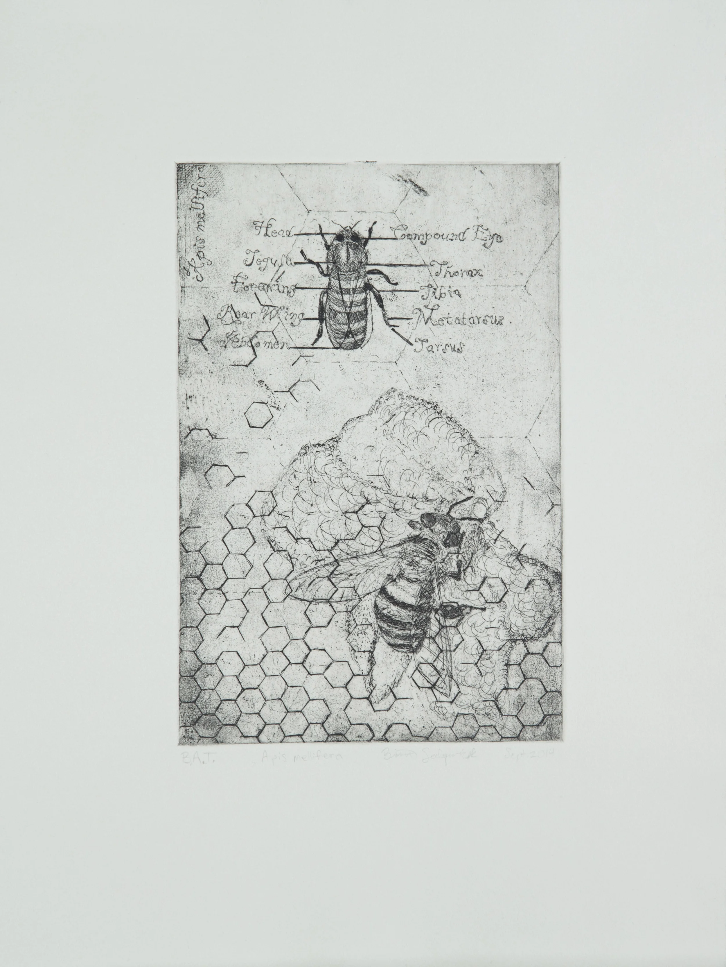 Apis Mellifera September 2014, Intaglio Etching Print on BFK Grey Paper, 9 x 6"