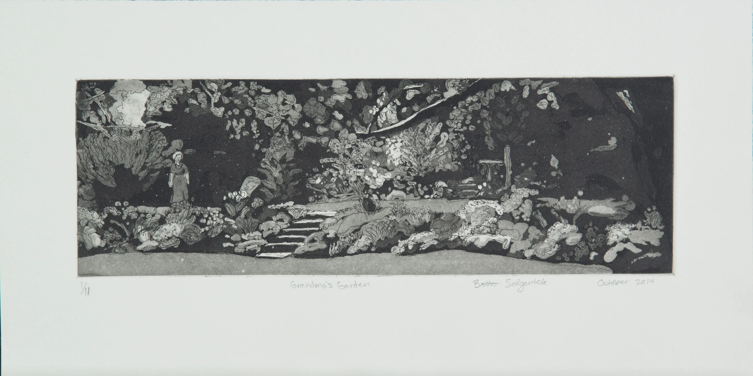 Grandma's Garden October 2014, Intaglio Etching and Aquatint Print on BFK Grey, 4 x 12"