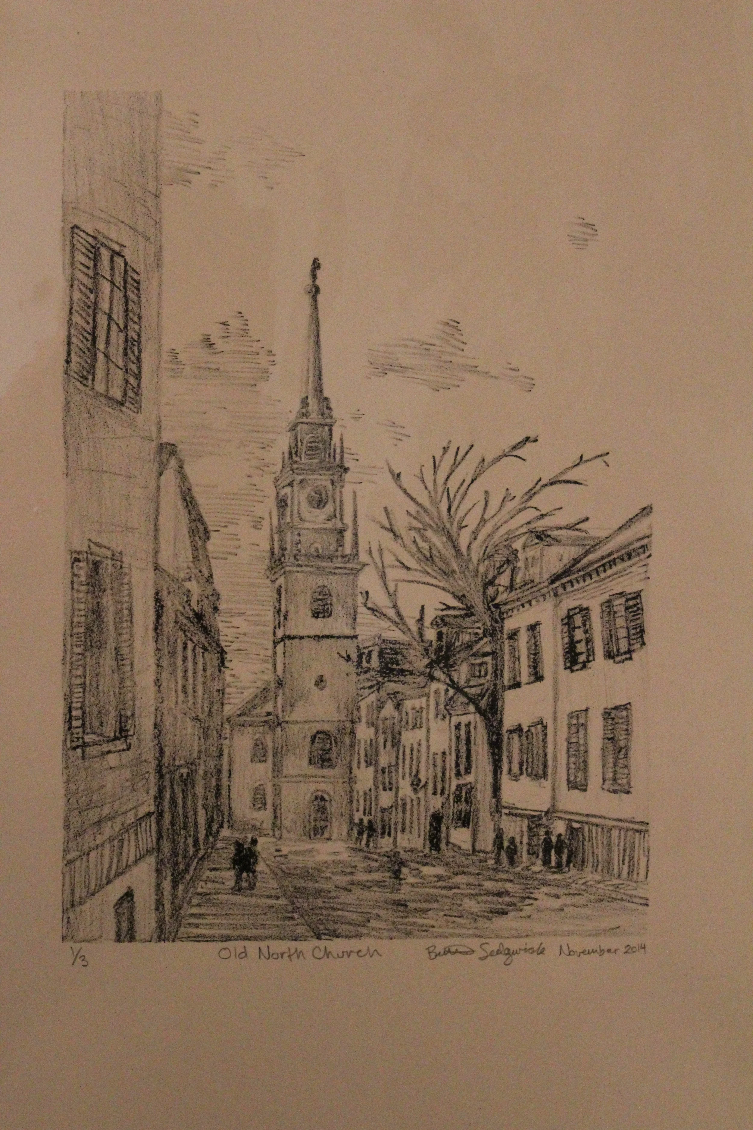 Old North Church November 2014, Lithography Print on Paper, 7 x 12"